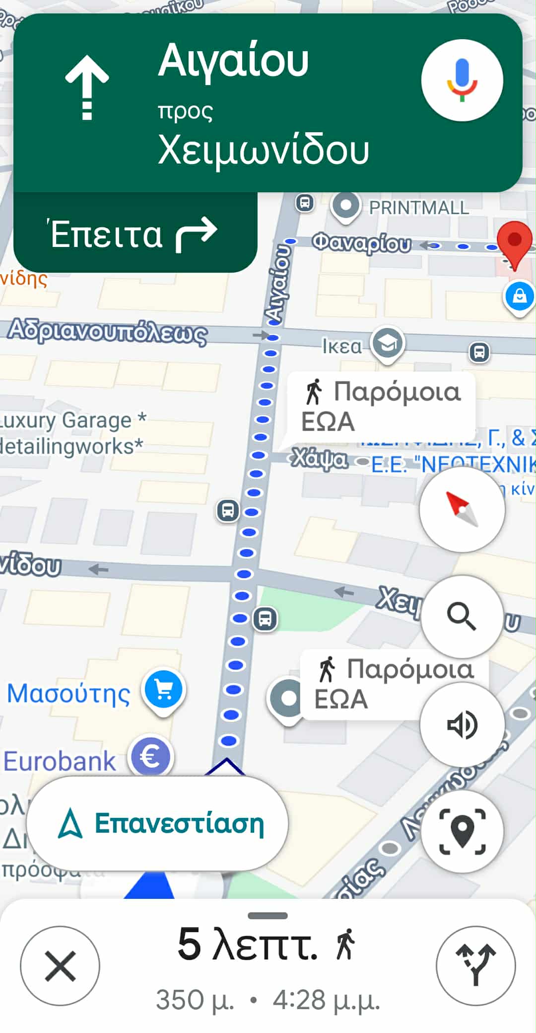Περπατήστε ευθεία επί της Αιγαίου, έχοντας στα αριστερά σας την Eurobank και το σούπερ μάρκετ Μασούτη. Αφού περάσετε την οδό Χειμωνίδου και φτάσετε στη μεγάλη διασταύρωση της Αιγαίου με την Αδριανουπόλεως, περάστε απέναντι πρώτα στο φανάρι της Αδριανουπόλεως και κατόπιν στο φανάρι της Αιγαίου, ώστε να βρεθείτε στην απέναντι πλευρά της Αιγαίου.